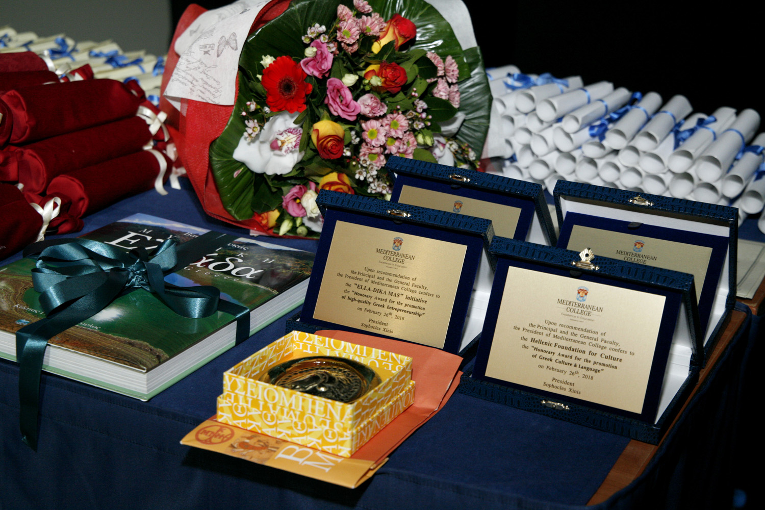 Στην εκδήλωση της Αθήνας, τιμητικές βραβεύσεις απονεμήθηκαν στο Ελληνικό Ίδρυμα Πολιτισμού (Ε.Ι.Π.) για την προώθηση του Ελληνικού Πολιτισμού και της Ελληνικής Γλώσσας και στην Πρωτοβουλία ΕΛΛΑ-ΔΙΚΑ ΜΑΣ για την Προώθηση της Υψηλής Ποιότητας Ελληνικής Επιχειρηματικότητας. Τα βραβεία παρέλαβαν ο Προϊστάμενος Διεθνών Σχέσεων του Ε.Ι.Π., Δρ Στέφανος Βαλιανάτος και ο Πρόεδρος της Πρωτοβουλίας ΕΛΛΑ-ΔΙΚΑ ΜΑΣ & Διευθυντής Εξαγωγών και Marketing AGRINO κ. Άγις Πιστιόλας, αντίστοιχα, οι οποίοι απηύθυναν σύντομο χαιρετισμό στους απόφοιτους.