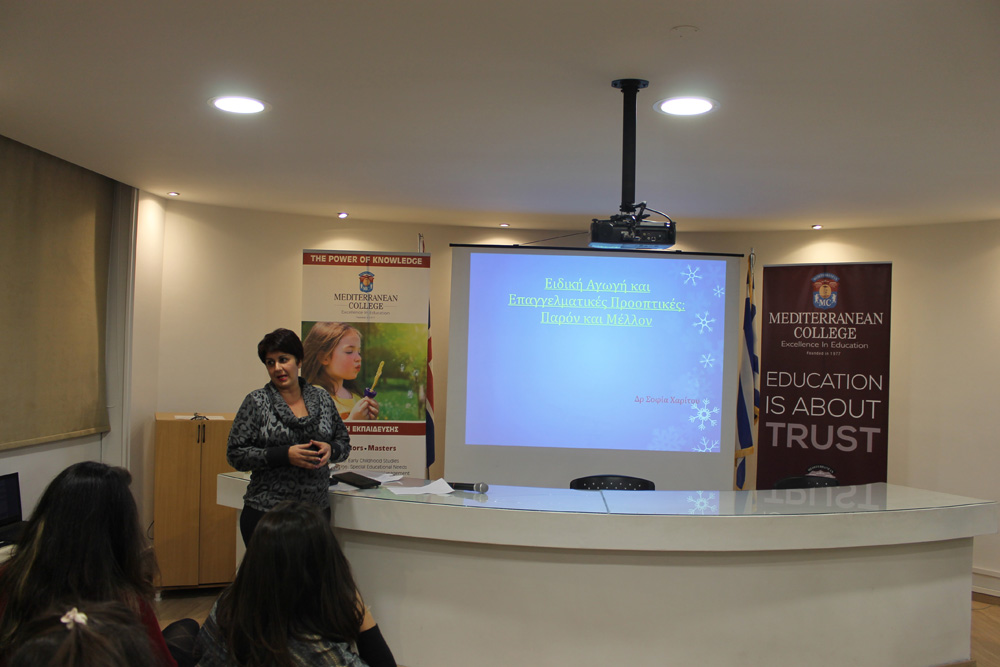 - Δρ. Σοφία Χαρίτου, Εργαστηριακό Διδακτικό Προσωπικό (μέλος ΕΔΙΠ), Εργαστήριο Προσαρμοσμένης Κινητικής Δραστηριότητας/ Αναπτυξιακών και Κινητικών Διαταραχών, Σ.Ε.Φ.Α.Α.- Παν/μιο Αθηνών – Η Δρ. Χαρίτου παρουσίασε νέες επαγγελματικές προοπτικές στην Ειδική Αγωγή και Εκπαίδευση στην Ελλάδα. Μίλησε για τους τομείς που ενδέχεται να έχουν μεγάλη επαγγελματική ζήτηση μελλοντικά και ενθάρρυνε τους συμμετέχοντες να στοχαστούν ως προς τις νέες ανάγκες που το επάγγελμα του Ειδικού Παιδαγωγού δύναται να καλύψει.