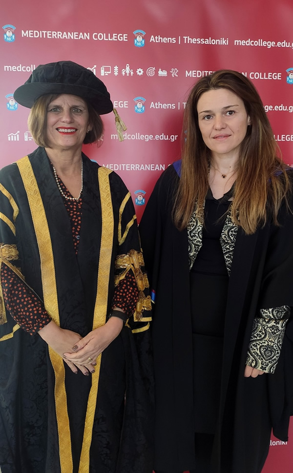 Εκπρόσωποι των συνεργαζόμενων Βρετανικών Πανεπιστημίων παρευρέθηκαν στις δύο εκδηλώσεις. Χαιρετισμό στους νέους απόφοιτους απηύθυναν η Vice Chancellor & Chief Executive του University of Derby, Professor Kathryn Mitchell. «Θέλω να αναγνωρίσω τη προσήλωση και τις θυσίες που πολλοί από εσάς έχετε κάνει, για να αποκτήσετε αυτό το πτυχίο και να θυμάστε ότι η επιτυχία σας παίζει σημαντικό ρόλο στην επιτυχία του πανεπιστημίου του Derby, αλλά και του Mediterranean College. Με την αυτοπεποίθηση και τη γνώση που αποκτήσατε, σας ζητάμε να κυνηγήσετε τώρα τους προσωπικούς σας στόχους και να πραγματοποιήσετε τις φιλοδοξίες σας. Κατανοούμε τις προκλήσεις που αντιμετωπίσατε. Δείξατε όμως αντοχή & ψυχικό σθένος και ως νέοι απόφοιτοί μας γνωρίζουμε ότι έχετε τη δύναμη, την αποφασιστικότητα και την ανθεκτικότητα να αξιοποιήσετε τις ευκαιρίες που θα σας δοθούν, αλλά και να ανταποκριθείτε αποτελεσματικά στις προκλήσεις που θα συναντήσετε!», τόνισε εμφατικά η κ. Mitchell.